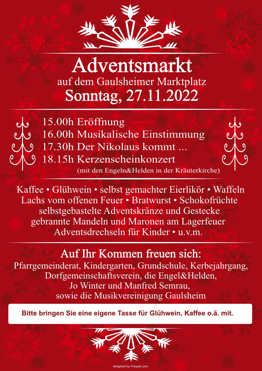 die Adventszeit kommt mit großen Schritten näher und damit auch unser traditioneller Gaulsheimer Adventsmarkt. Wie immer am 1. Adventssonntag wollen wir uns auch diesmal wieder auf dem Marktplatz unter der Gaulsheimer Weihnachtstanne treffen, um gemütlich bei einer Tasse Glühwein, Kaffee oder Punsch den Advent einzuläuten.